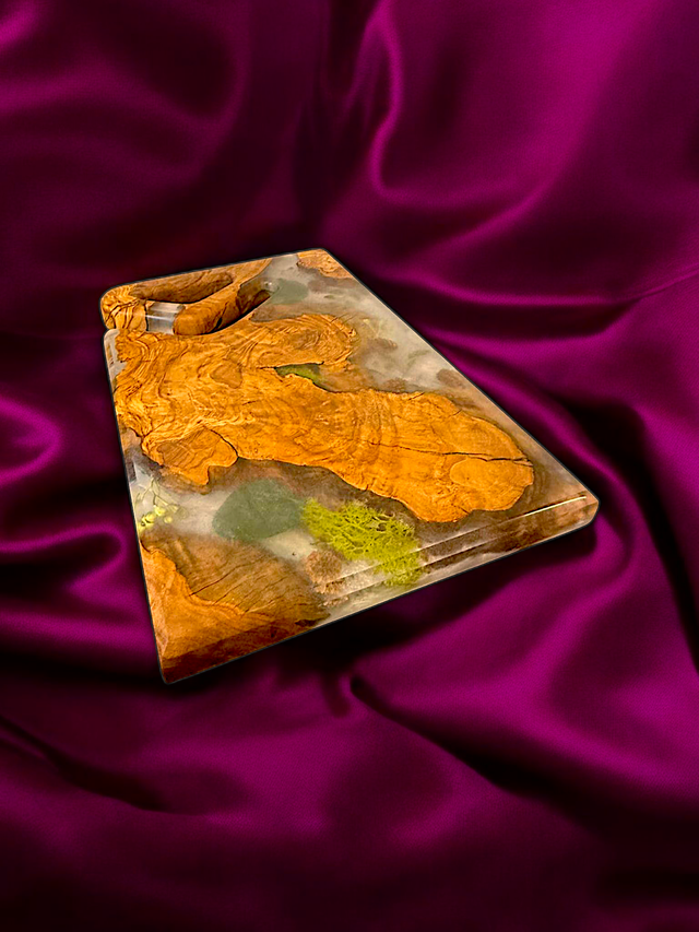Dieses besondere Stück fängt die Schönheit der Natur auf einzigartige Weise ein: Zarte Blätter, feines Moos und kleine Knospen wurden kunstvoll in das Harz eingegossen und verleihen dem Brett eine organische und lebendige Ausstrahlung. Der sorgfältig handgefräste Griff sorgt für eine angenehme Handhabung.